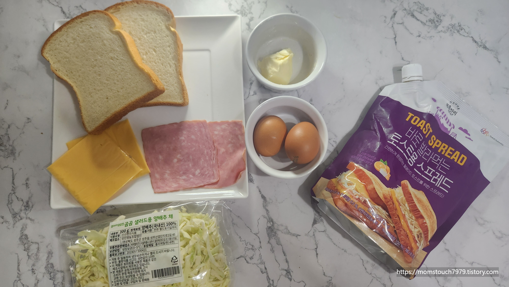 준비물: 식빵 두 조각, 버터, 계란, 치즈, 햄 그리고 채 썬 양배추 준비해 주시면 좋겠습니다. (집에 양상추 있으시면 그걸 넣어도 좋을 것 같습니다. 피클을 더 넣어도 좋겠지만 이미 스프레드 안에 피클이 포함되어 있어서 저는 피클은 제외했습니다. 나중에 먹어보니 더 아삭한 식감을 원하시면 피클 따로 넣으셔도 좋을 것 같습니다.)