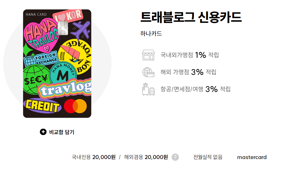 트래블로그는 해외여행에 특화된 카드입니다. 트래블로그 서비스는 론칭 11개월 만에 가입자 수 100만명을 돌파했을 정도로 폭발적인 인기를 누리고 있습니다. 전월 실적이 없어도 환율 우대 100%, 해외 이용 수수료 무료, 해외 ATM 인출 수수료 무료 혜택을 제공합니다. 최근 체크카드에 이어 포인트 적립 기능을 추가한 트래블로그 신용카드를 출시했습니다. 트래블로그는 하나금융그룹의 해외여행 특화 서비스 플랫폼으로 '디지털 환전'이라는 혁신금융서비스를 기반으로 하고 있습니다. 연회비도 없고 해외 결제와 ATM 출금 시 수수료도 '0원'이니 부담없이 가입하고 해외여행 떠나면 좋을 것 같아요. 트래블로그 카드는 체크. 신용카드로 선택할 수 있습니다.