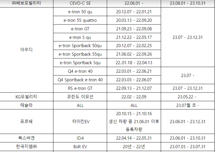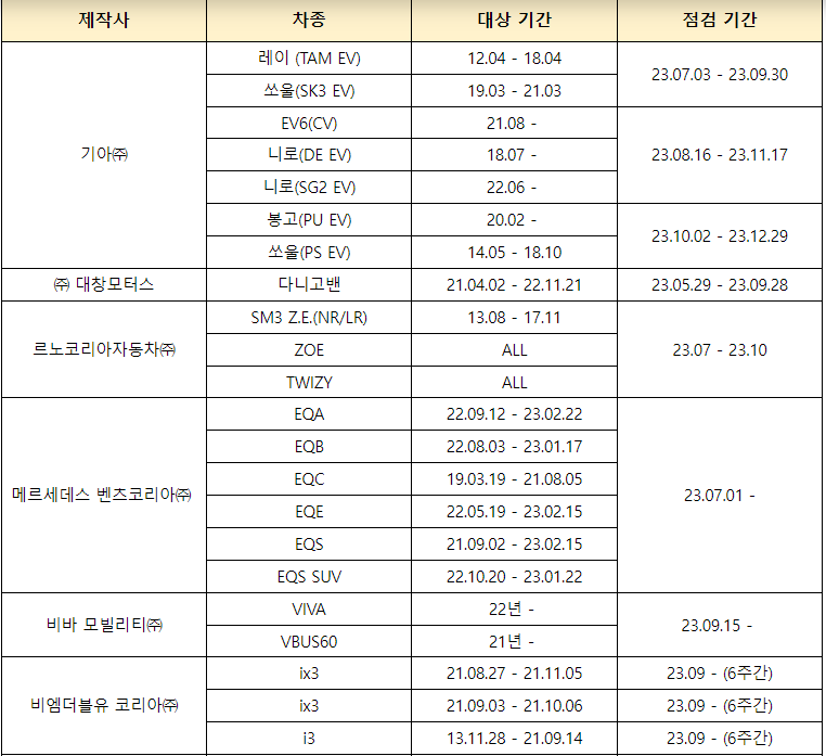 국산· 수입산 약 50여개 차종에 대하여 이상이 있는 경우 수리 안내를 받을 수 있고 일부 차종의 경우 배터리관리시스템에 업데이트를 진행하는 등 종합무상안전점검을 받을 수 있습니다.