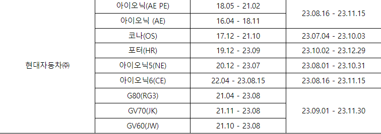 *제작사별 점검 일정을 확인 후 해당차종의 점검 일정에 가까운 차량 서비스센터에 방문하여 점검받을 수 있으니 잊지 말고 자신의 안전을 위해 점검받으시면 좋을 것 같습니다.