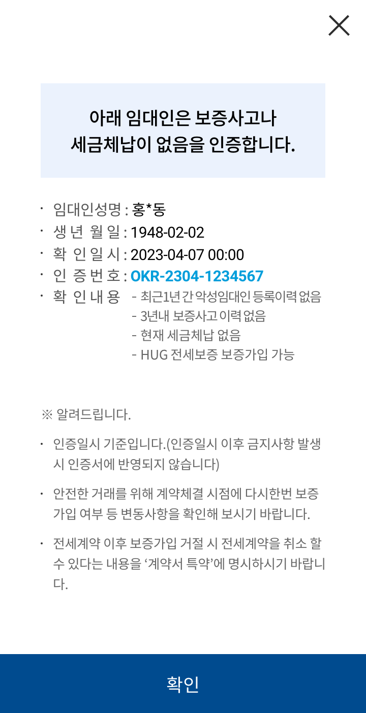 • 악성임대인 여부, 보증사고 이력, 보증가입 금지여부에 이어 국세・지방세 체납여부도 확인할 수 있습니다. 임차인이 카카오톡으로 집주인에게 신청하면 임차인 폰으로 손쉽게 확인이 가능합니다.