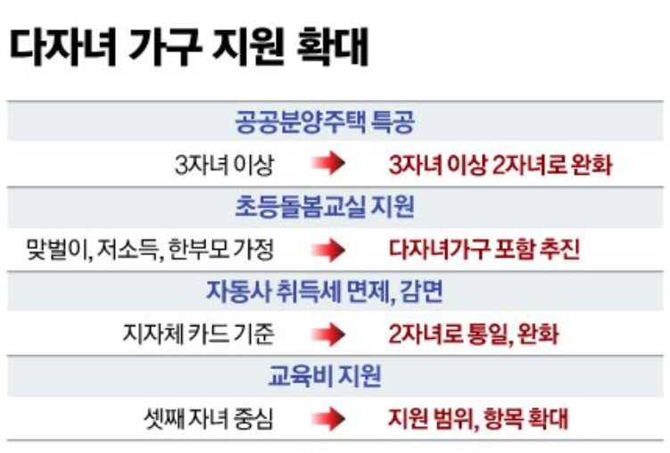저출산·고령사회 정책과제 및 추진방향’에 따라 다자녀 혜택 기준이 3자녀에서 2자녀로 완화됩니다. 심각한 저출산과 인구감소에 따른 정책의 변화가 시작이 되었는데요. 아파트의 특별 공급이나 자동차 취득세 감면 말고도 초중고 교육비도 2자녀 가구 혹은 첫째 자녀부터 지원하는 방향으로 개선하고 국민연금 출산크레딧을 개편하는 등 다자녀 가구 양육·교육 지원도 확대한다고 하니 새로운 지원 정책에 그동안 부담되었던 양육비에 조금이나마 도움이 될 것 같습니다.