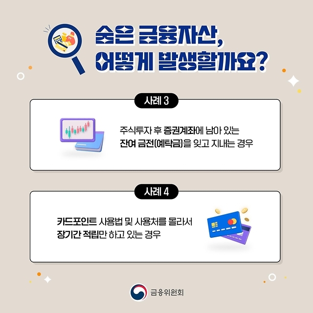 사례 1 ~ 4를 통해 숨은 금융자산이 발생하는 이유를 확인할 수 있으세요. 혹시 자신도 그런 경우에 해당이 될 수 있으니 한번 찾아보시면 좋을 것 같습니다.