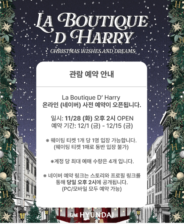 항상 이맘때쯤이면 연말을 화려하게 장식하는 백화점의 미디어아트와 트리는 많은 사람들을 기다리게 하는데요. 오늘은 더현대 H빌리지 크리스마스 예약 3차 일정이 나왔습니다. 예약하시려는 분들과 함께 공유해 보겠습니다.