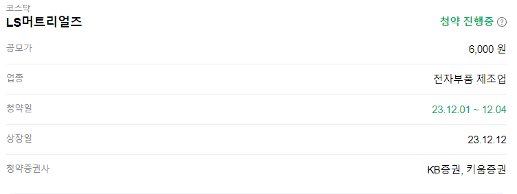 청약일은 2023. 12.01 ~ 12.04(월)까지입니다. 공모가는 최종 6,000원으로 결정이 되었으며 상장일은 23.12.12일입니다.  청약 증권사는 KB증권과 키움증권에서 가능합니다.