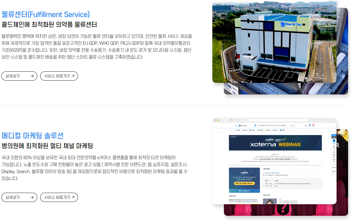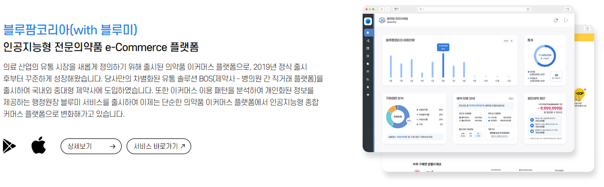 2015년 설립된 블루엠텍은 의약품 e커머스 플랫폼 기업입니다. 의약품의 쿠팡으로 생각하시면 훨씬 접근이 쉬어질 것 같아요. 국내외 주요 제약사와 제휴하여 첨단 물류시스템을 확보한 뒤 병·의원에게 온라인 의약품을 유통하고 있습니다. 블루엠텍은 최근 제약사의 비용 절감을 위한 풀필먼트 서비스와 원내 의약품의 주문과 재고관리를 돕는 서비스인 행정 원장 '블루미'를 론칭했습니다. 블루엠텍은 블루미를 통해 병·의원 경영관리에 도움을 주는 소프트웨어 개발, 비급여 의약품의 처방과 치료관리를 돕는 다양한 서비스를 개발하는 등의 서비스를 확대할 예정이라고 합니다.