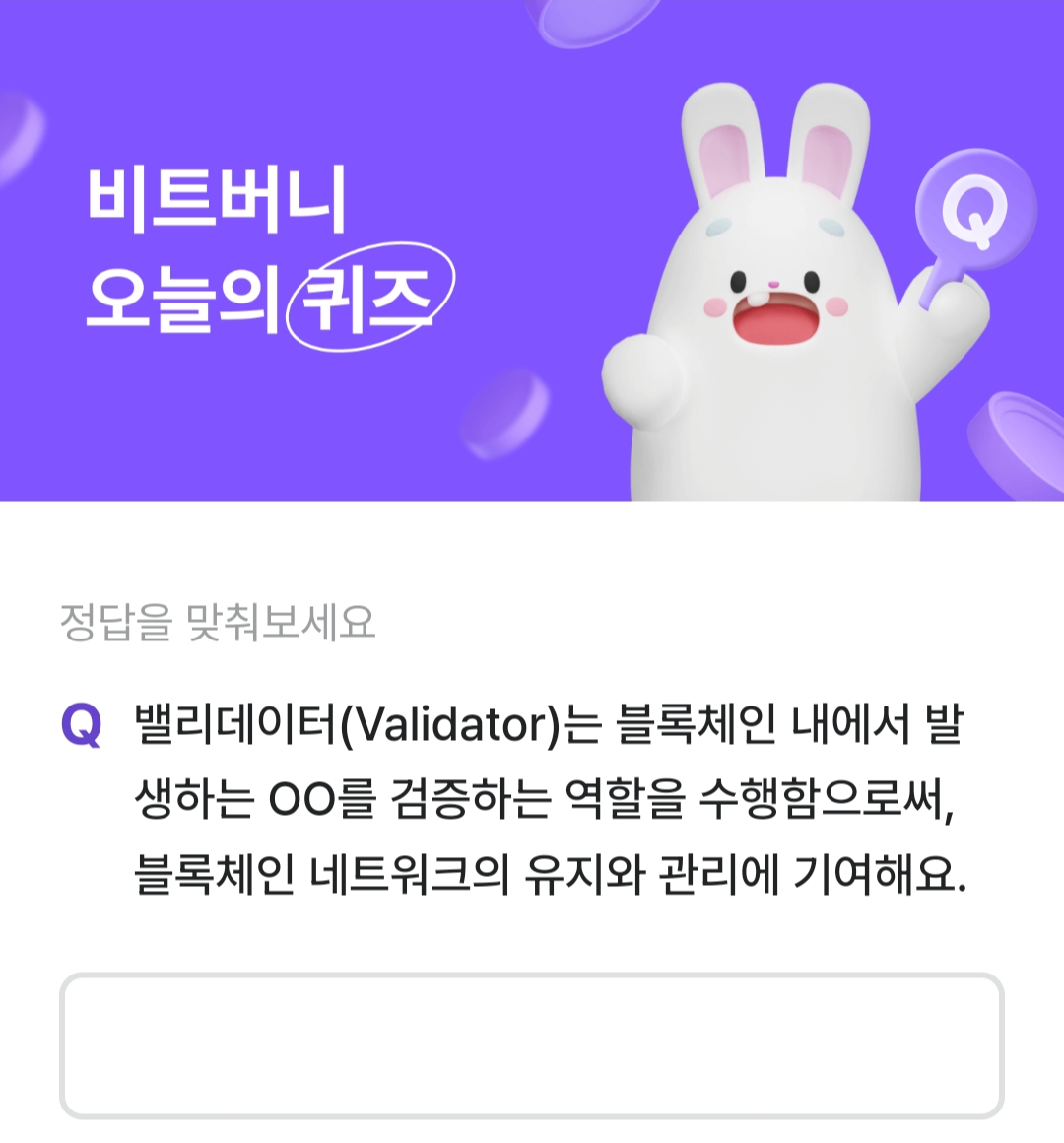 앞으로는 데이터를 누가 더 잘 활용하느냐가 경쟁력의 핵심이 될 거라고 합니다. 그래서 최근에는 밸리데이터라는 직업도 생겼는데요. 밸리데이터는 블록체인 상에서 거래되는 데이터의 신뢰성을 검증하고 인증하는 역할을 하는 사람을 말해요. 만약 누군가가 A라는 회사의 주식을 사고 싶다고 한다면 그 주식이 진짜 A 회사의 주식인지 확인해야 하잖아요. 그럴 때 밸리데이터가 해당 주식의 진위성을 검증해 주는 거예요. 그런데 이 밸리데이터는 아무나 될 수 없어요. 일단 블록체인에 대한 이해가 있어야 하고 암호화폐에 대한 지식도 있어야 해요. 그리고 무엇보다 데이터를 정확하게 분석하고 판단할 수 있는 능력이 필요하죠. 이렇게 데이터 이코노미와 밸리데이터에 대해 알아봤는데요. 어떠신가요? 데이터의 가치와 중요성이 더 느껴지시나요? 오늘은 비트버니 퀴즈를 통해 밸리데이터와 4차 산업혁명 시대의 데이터이코노미와 밸리데이터에 대한 알아봤는데요~ 내일은 또 무슨 퀴즈로 공부하게 될지 벌써부터 궁금해집니다.