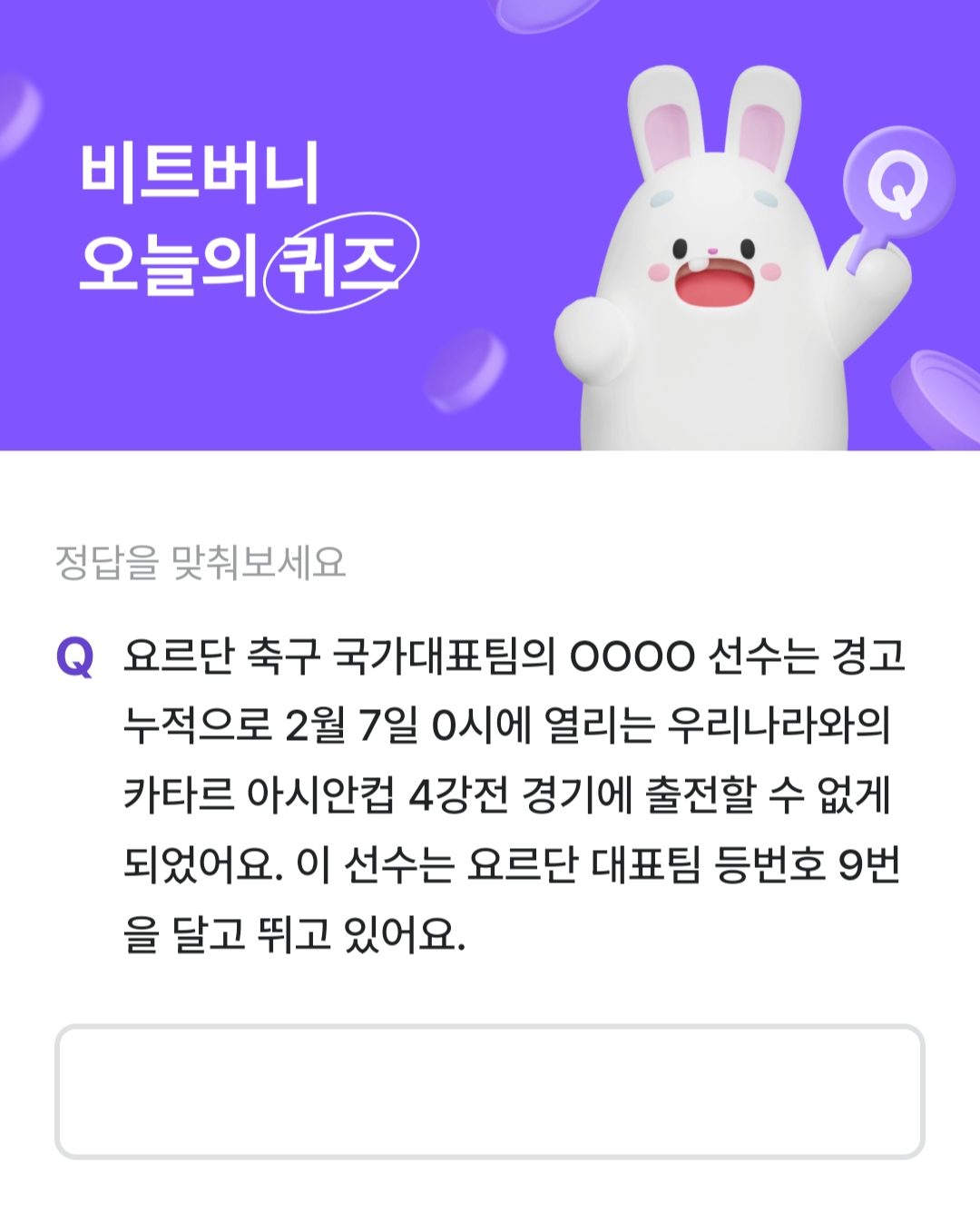 요르단 축구 국가대표팀의 ○○○○ 선수는 경고 누적으로 2월 7일 0시에 열리는 우리나라와의 카타르 아시안컵 4강전 경기에 출전할 수 없게 되었어요. 이 선수는 요르단 대표팀 등번호 9번을 달고 뛰고 있어요.