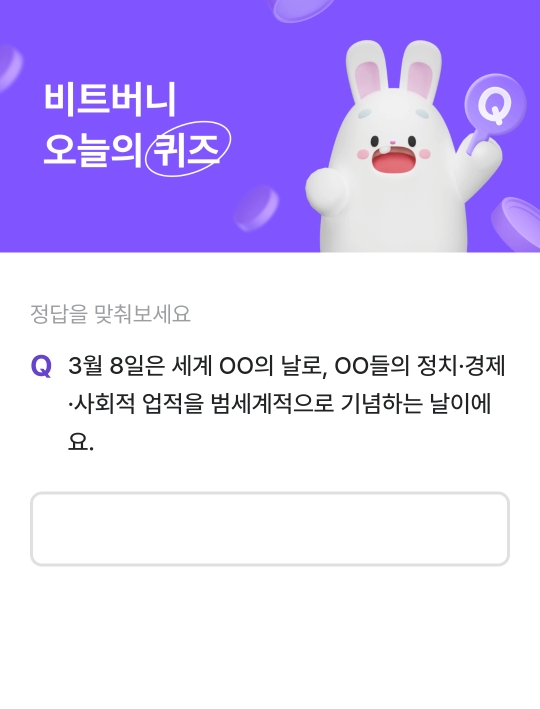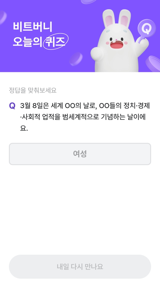 오늘은 비트버니 퀴즈 덕분에 세계 여성의 날의 의미를 되새겨 봤는데요! 내일 새로운 퀴즈와 함께 또 만나요!