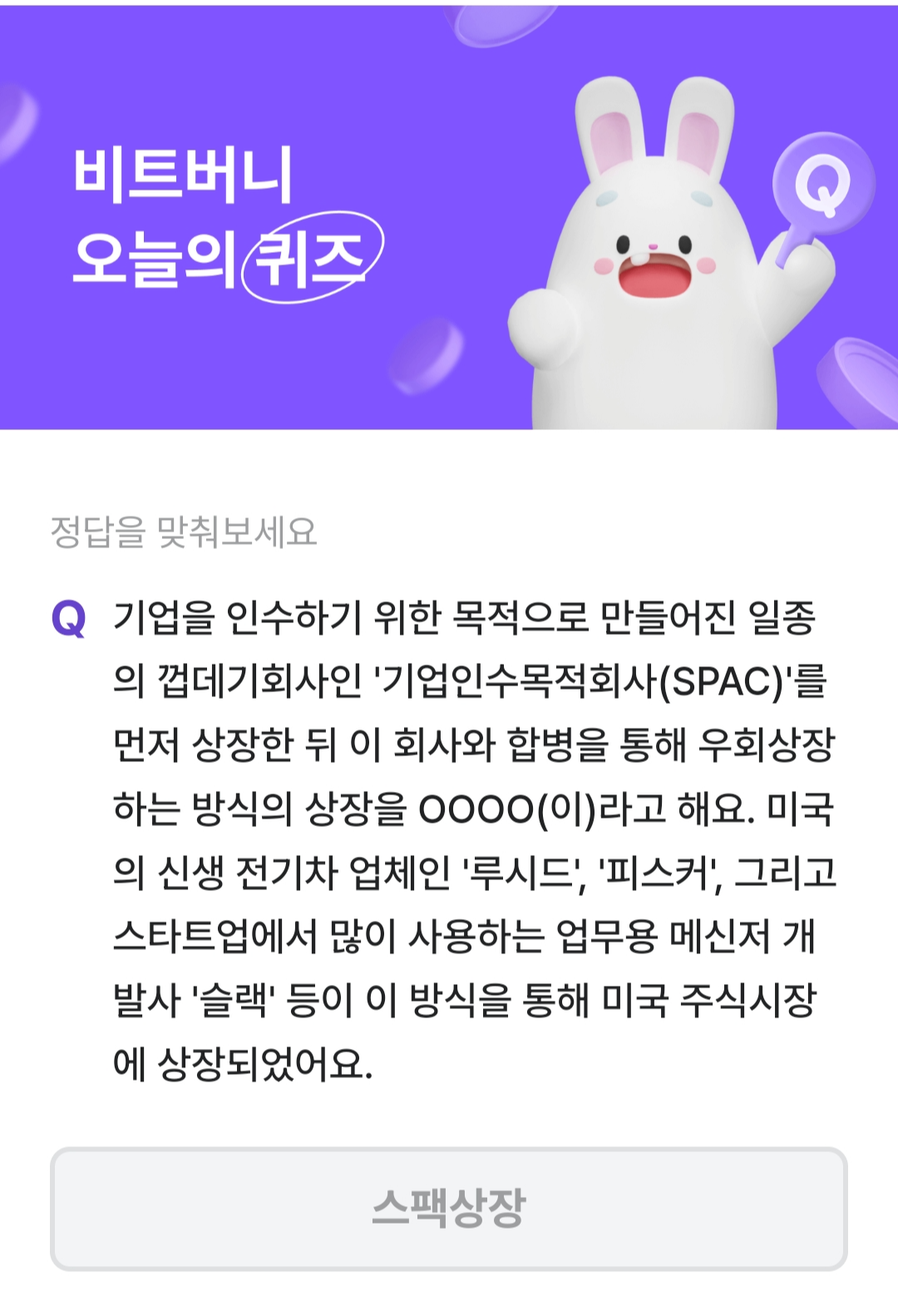 비트버니 오늘의 퀴즈를 풀기 전 경제 용어 중에 기업인수목적회사 (SPAC)에 대해 먼저 알아봐야겠어요.
