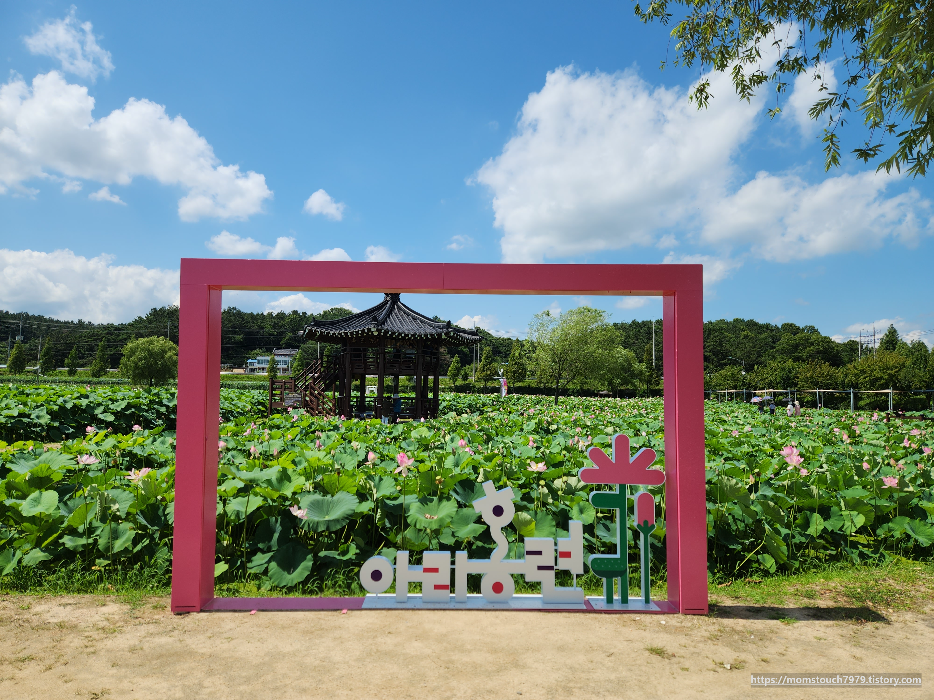 연꽃테마파크 입구에는 양산이 준비되어 있으니 핑크빛 양산과 함께 연꽃 포토존에서 사진을 남기셔도 좋을 것 같습니다. 안개 분사와 중간에 쉴수 있는 의자들이 있으니 더위를 식히며 연꽃 풍경을 감상하시면 좋을 것 같아요..