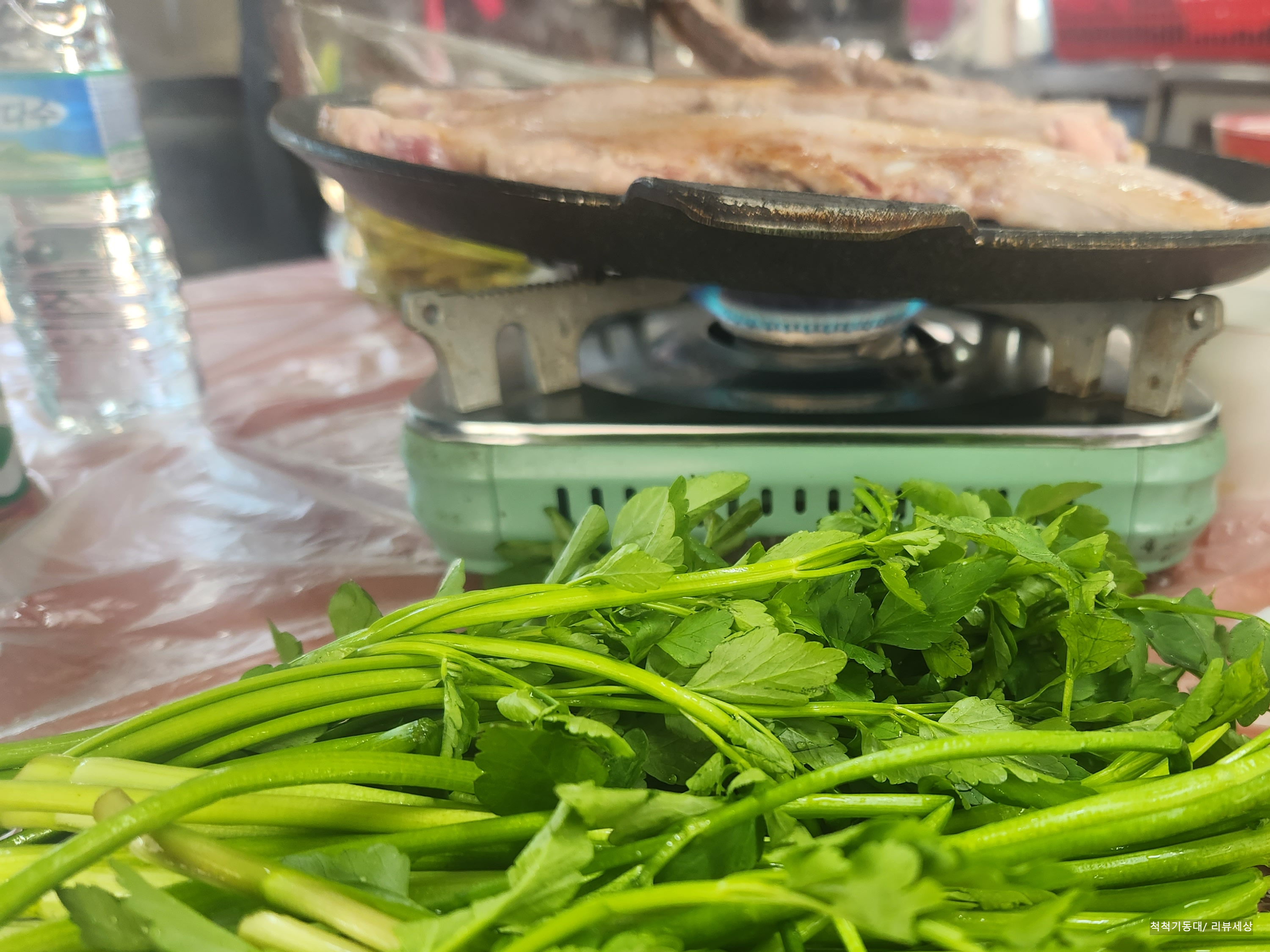 청도 주위에는 삼겹살 식당도 많지만 저는 고기와 다른 음식들을 준비해 상차림비와 미니리만 시켜서 먹는 비닐하우스 농가 식당으로 갔습니다. 불판에 여러 사람들과 지글지글 거리며 먹는 미나리 삼겹살이란 경험하지 못한 분들은 쉽게 상상이 가지 않으실 것 같습니다. 야외에서 먹는 캠핑 감성과 향긋한 미나리와의 한쌈은 겨우내 몸속에 배출되지 않았던 노폐물과 움츠렸던 몸까지 하나하나 깨치는 맛이었습니다. 경상도와 가까우신 분들이라면 현재 원동 미나리 축제로 향하시거나 청도에서 맛있는 미나리 삼겹살을 드셔 보시는 거 추천드려 봅니다. 이렇게 쓰고 있자니 또 침이 고이는 건 어쩔 수 없나 봅니다. 혹시나 청도 미나리 삼겹살을 식당이 아닌 저처럼 비닐 하우스 농가에서 드실 분들은 티맵에서 한재골 찾으셔서 가시면 그곳에 10군데 정도의 식당이 있습니다.