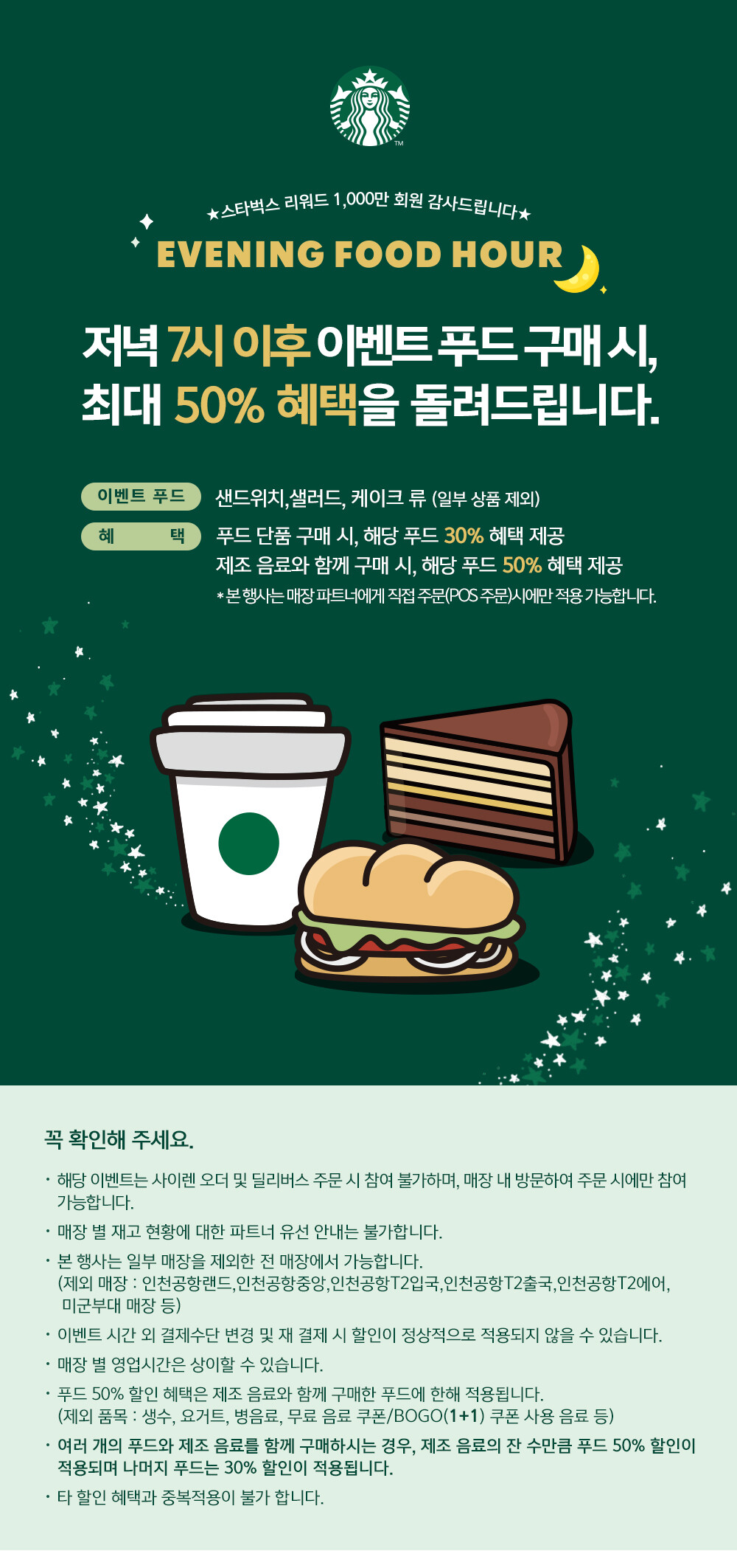 '이브닝 푸드아워' 대상 푸드는 'B.E.L.T 샌드위치 ', '크린베리 치킨 치즈 샌드위치', '햄&루꼴라 올리브 샌드위치' 등 샌드위치류와 샐러드류를 포함해 '부드러운 생크림 카스텔라', '클라우드 치즈 케이크', '부드러운 티라미수 롤' 등 케이크류에 해당 혜택이 적용됩니다. 일부 제품은 제외될 수도 있으니 직접 매장에서 참고하시면 좋을 것 같습니다. 푸드 50% 할인 혜택은 제조 음료를 함께 구매하시는 경우, 제조 음료의 잔 수만큼 푸드 50% 할인이 적용되며 나머지 푸드는 30% 할인이 적용됩니다. 타 할인 혜택과 중복적용은 불가합니다.