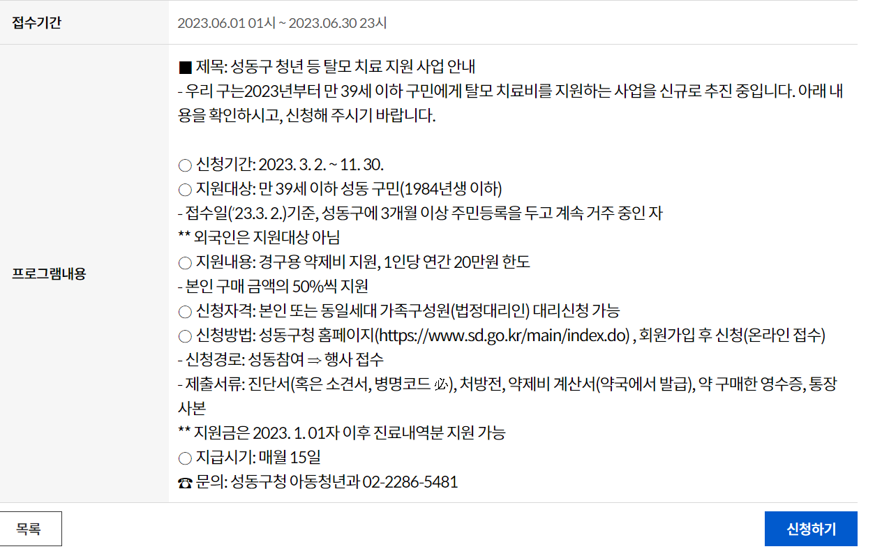 성동구청 홈페이지에 들어가 성동참여 온라인 접수에 들어가면 위에 같은 화면이 있습니다. 6월의 경우 2023년 성동구 청년 등 탈모 치료 지원사업 신청란을 클릭하여 접수하시면 됩니다.