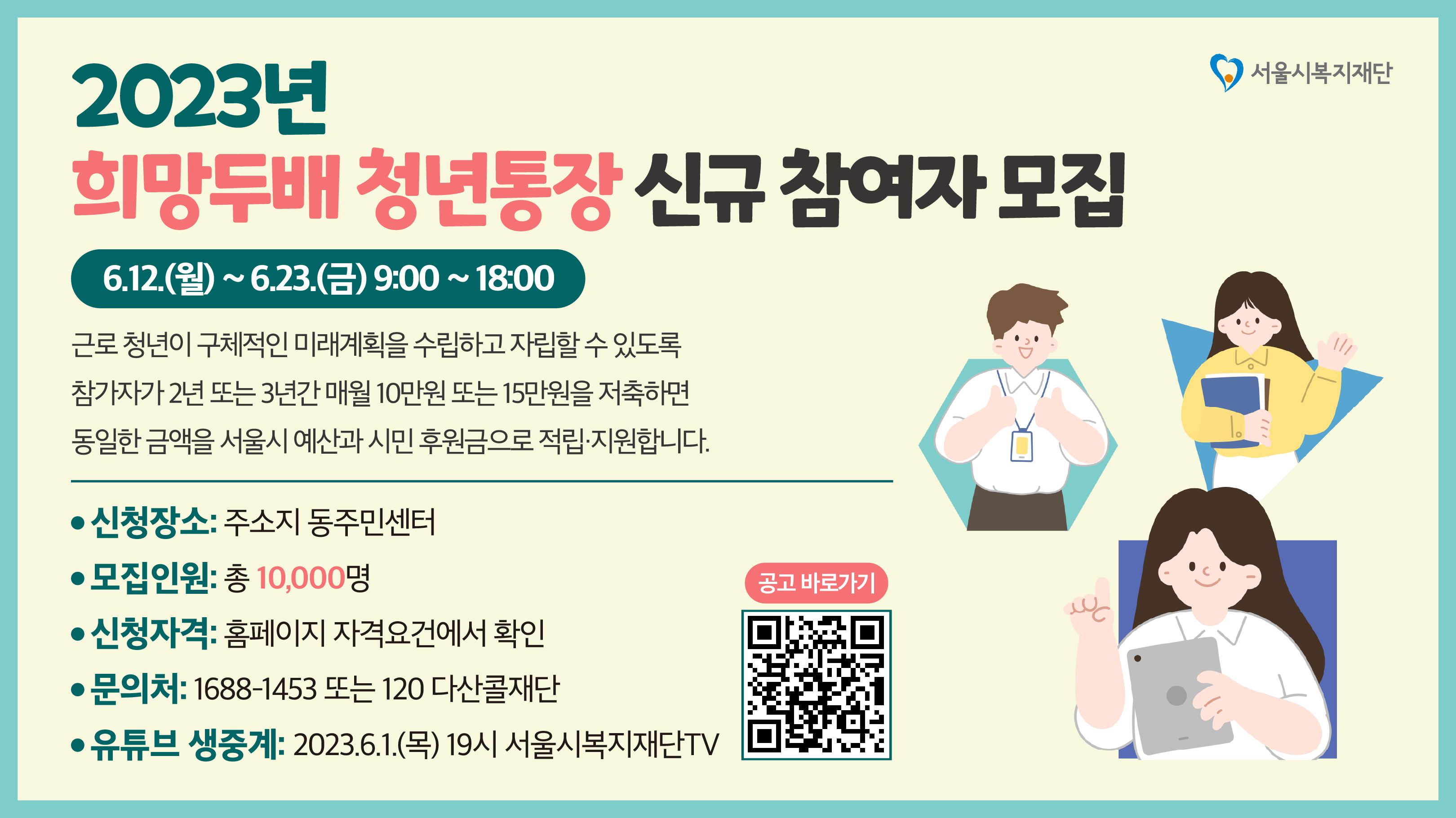 서울시에서 일하는 청년들이 희망찬 미래를 준비할 수 있도록 자산형성을 지원하는 「희망두배 청년통장」의 2023년 신규 참여자를 아래와 같이 모집합니다.
