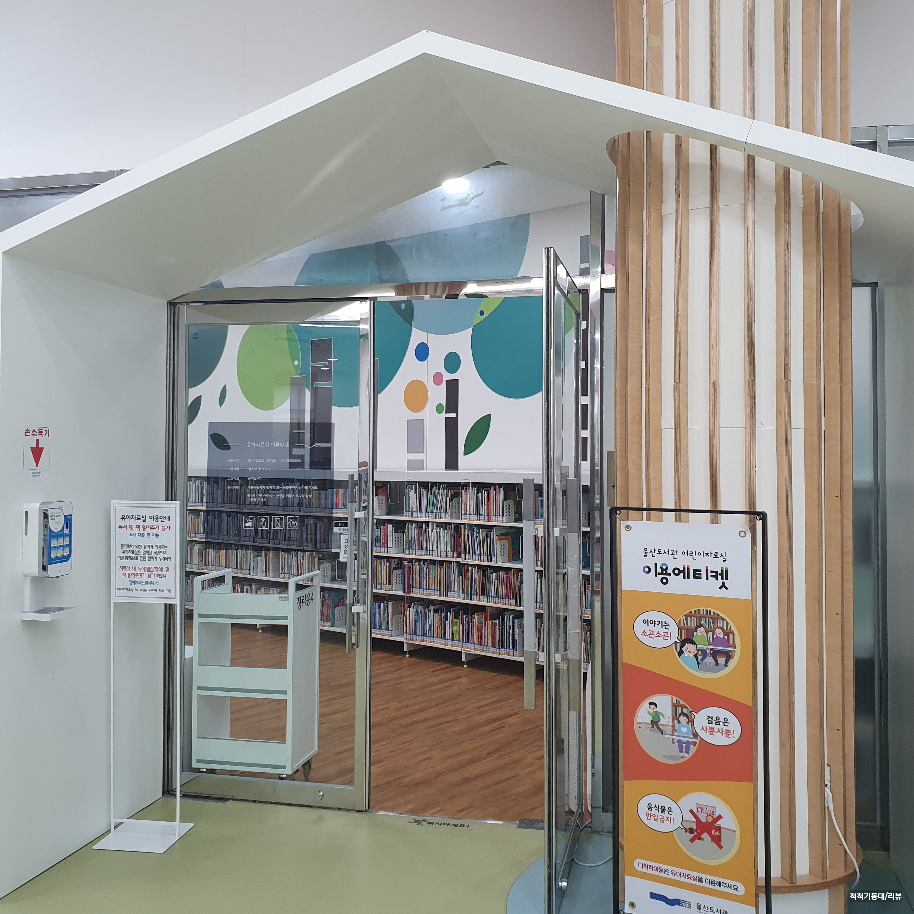 1층 입구에는 도서관을 나타 내는 책들이 높게 쌓인 인테리어도 한눈에 도서관임을 알 수 있어요. 1층에는 어린이자료실과 예약 가능한 스터디룸들이 있습니다. 가끔씩 전시관에서 다양한 전시 체험을 해서 일정만 잘 맞는다면 좋은 체험의 기회도 맛볼 수 있습니다. 어린이집이나 유치원에서도 도서관 견학과 전시 체험 이용하는 풍경들 자주 보게 돼요.