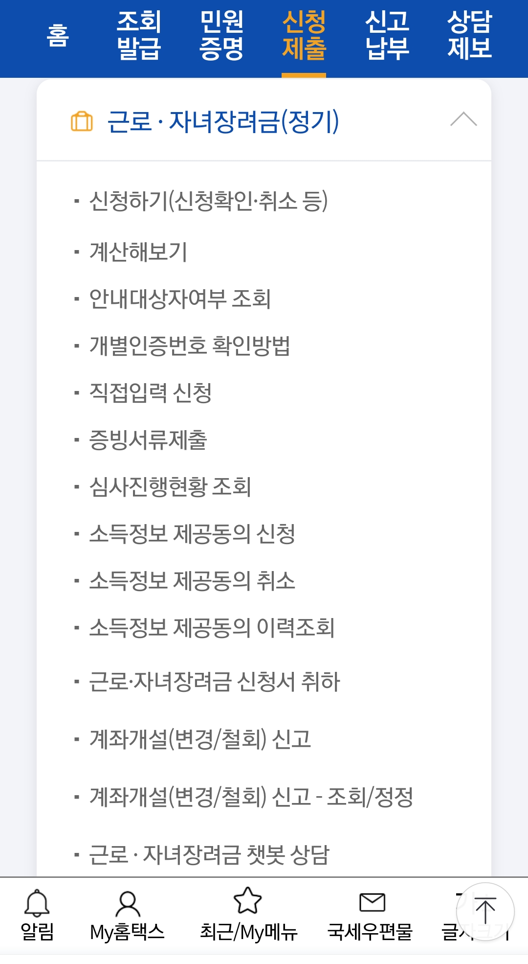 홈택스(모바일앱) 앱스토어(구글 Play스토어, 아이폰 앱스토어)에서 홈택스(모바일앱) 설치 → 로그인 → 신청/제출 → 근로·자녀장려금(정기/반기) → 신청하기를 하면 됩니다.