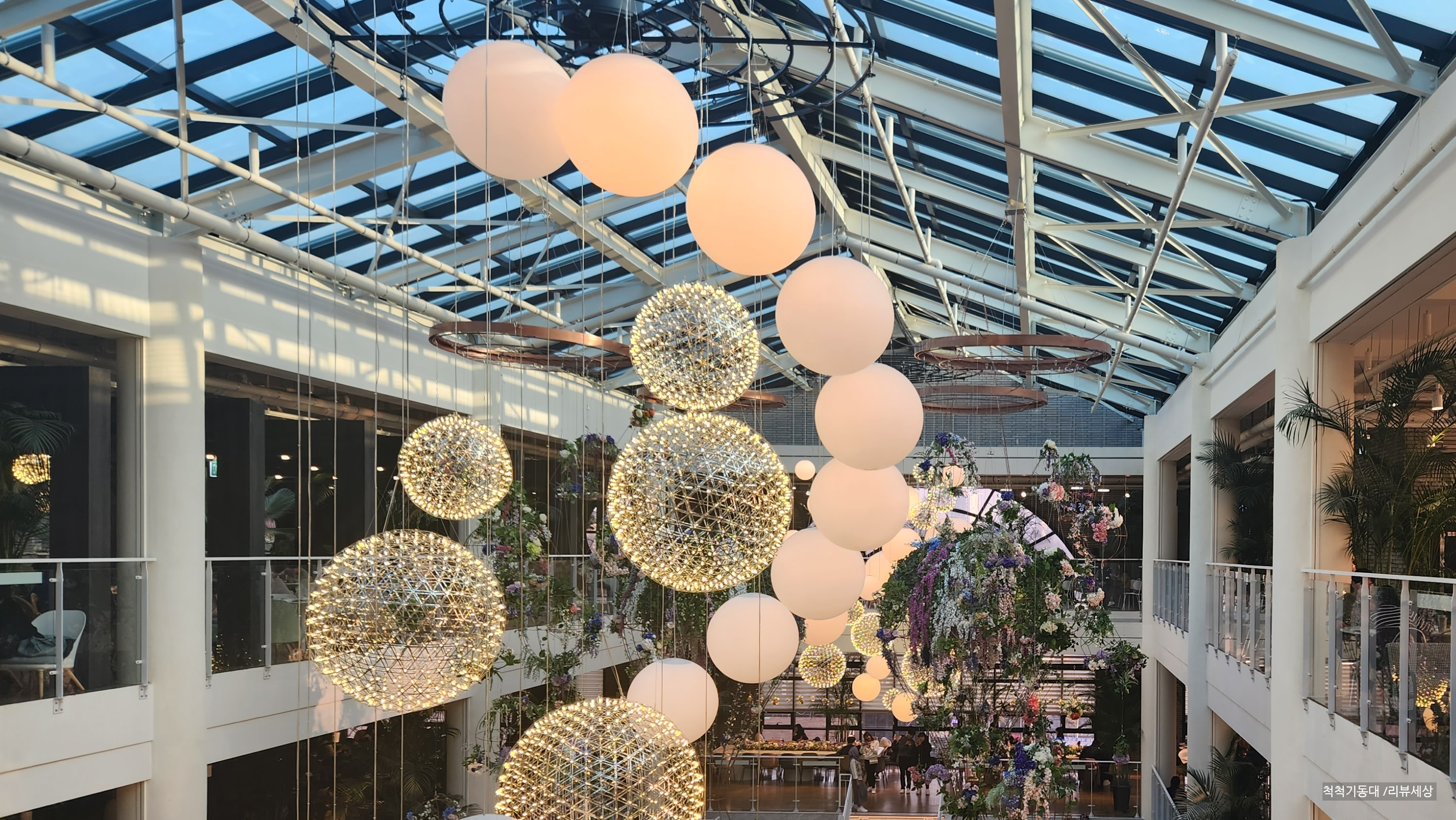 각 층마다 다른 콘셉트로 되어 있고 각각 포토존도 모두 다르기에 찍는 곳마다 인생샷 예쁘게 건질 수 있는 공간들 많았습니다. 단 포토존에 사람들이 많아서 안전에 유의하면서 찍으시면 더 좋을 것 같아요~ 초록의 뷰와 하늘이 보이는 천장에 수놓은 거대한 샹들리에는 송도 포레스트 아웃팅스의 상징이 될 듯싶을 정도로 화려하면서 나무들과 아주 잘 어울렸어요.