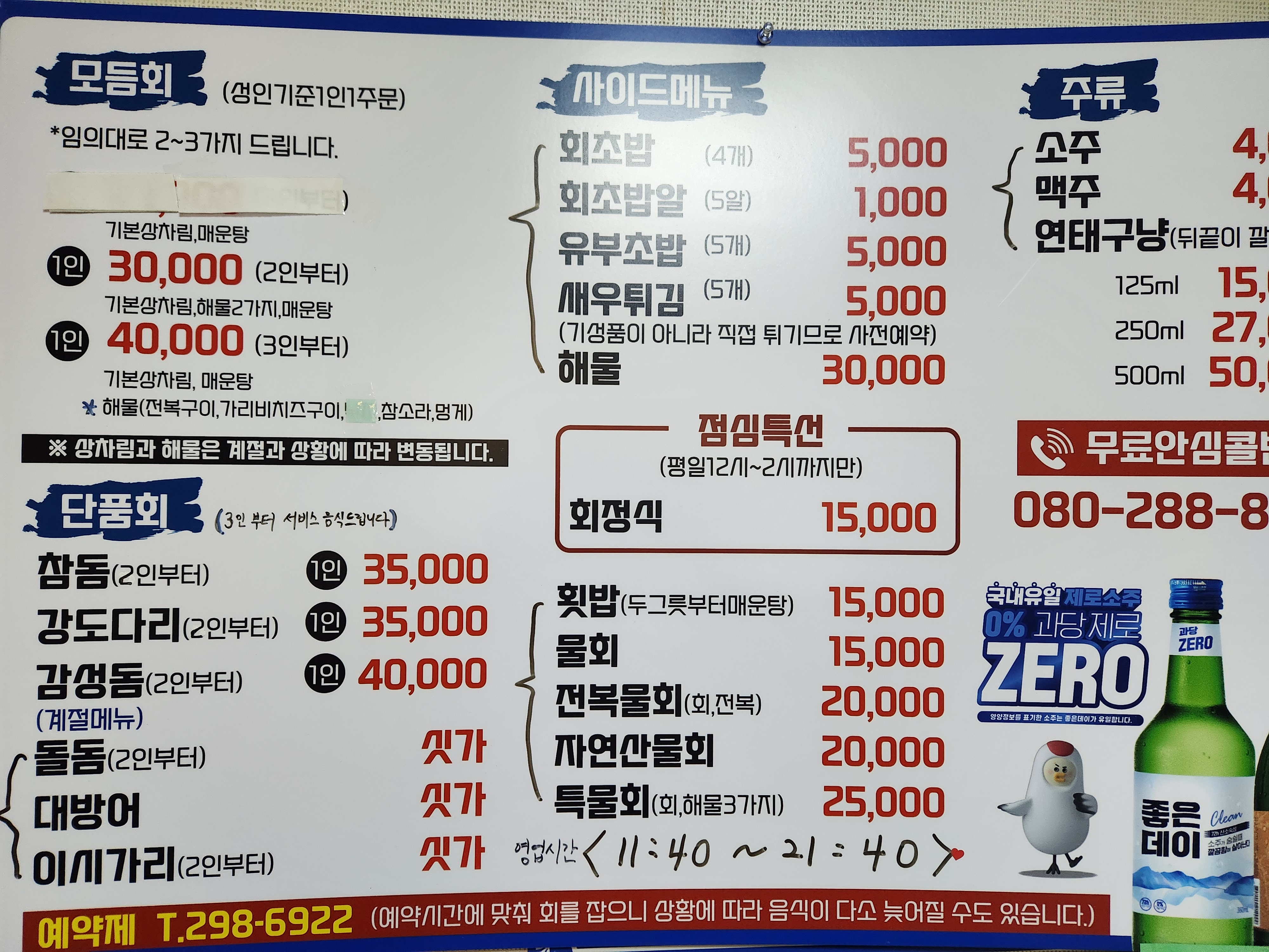 - 단품회와 모둠회 주문가능하고 포장도 가능합니다.