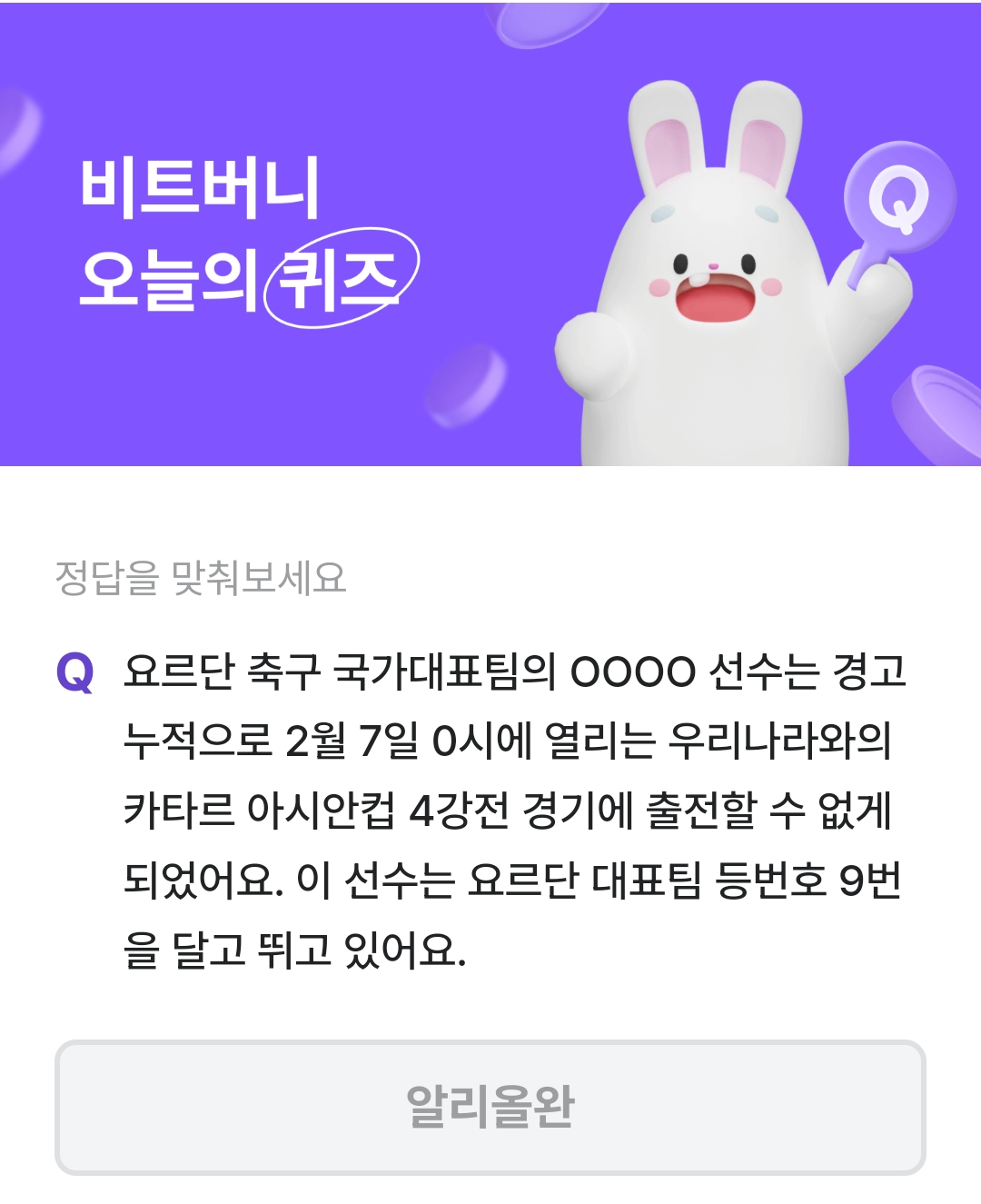 | 비트버니 오늘의 퀴즈 정답 확인 2월 3일, 한국 4강 일정 (4) | 2024.02.03 |