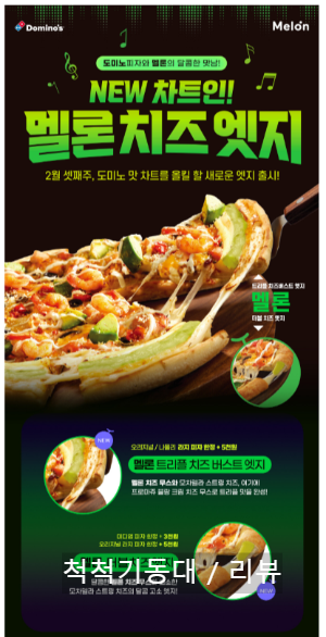 ● 2월 13 ~ 2월 28일까지는 멜론 치즈 엣지 새로운 메뉴 출시 기념으로 음악 스트리밍 멜론과 다양한 이벤트 중이더라고요. 멜론 트리플 치즈 피자는 또 어떤 맛일까 궁금해집니다!