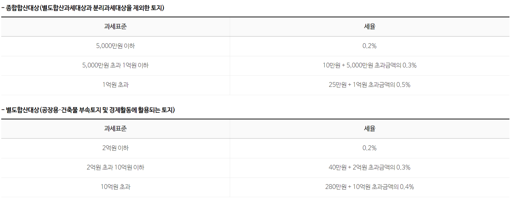 - 토지 : 0.2%~0.5% (종합합산·별도합산·분리과세대상에 따른 3단계 누진세율)