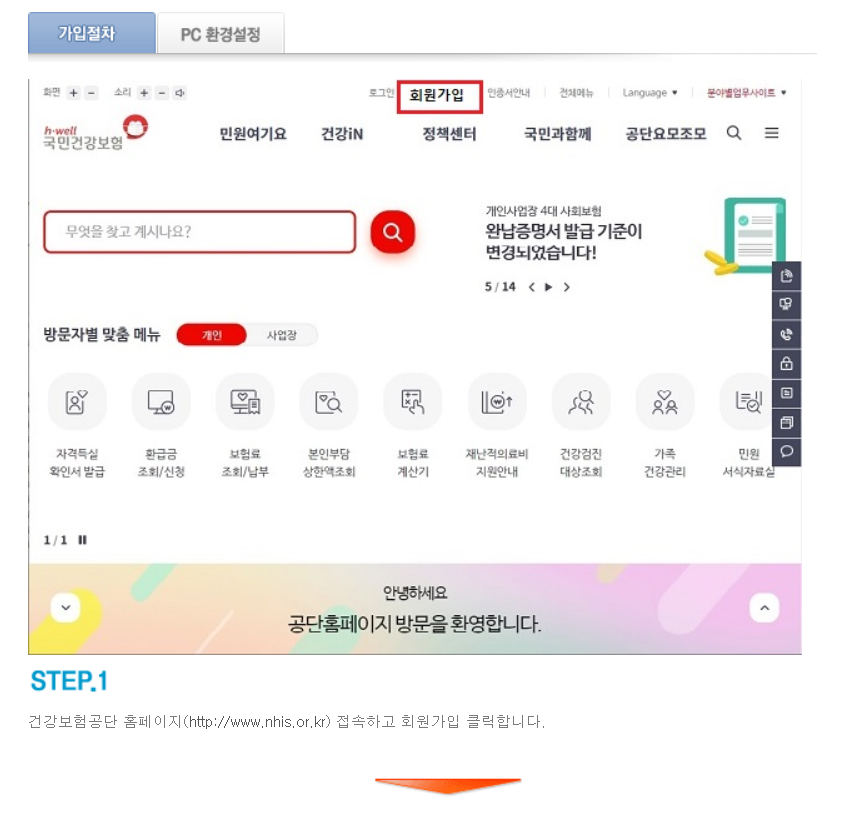 1단계 - 건강보험 홈페이지에 접속하고 회원가입을 클릭합니다.