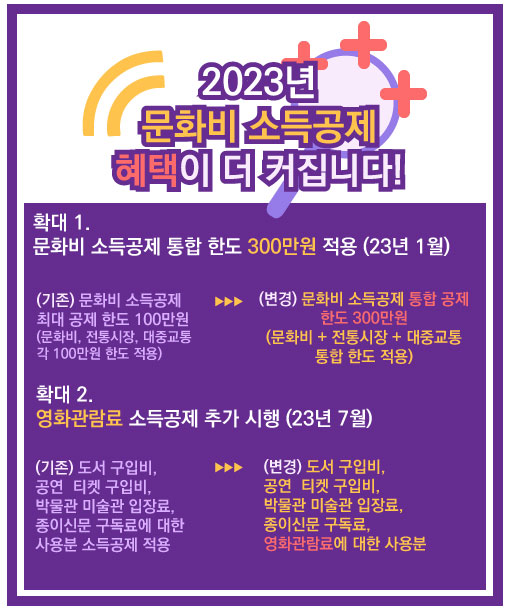 한국문화정보원(문체부)에 문화비 소득공제 사업자로 등록된 사업자에게 신용카드 등으로 문화비 소득공제 상품 (도서, 공연티켓, 박물관 미술관 입장권, 종이신문 구독, 영화티켓(’23년 7월 결제분부터 적용)을 구매할 경우 연말정산 시 추가 소득공제 적용됩니다. )