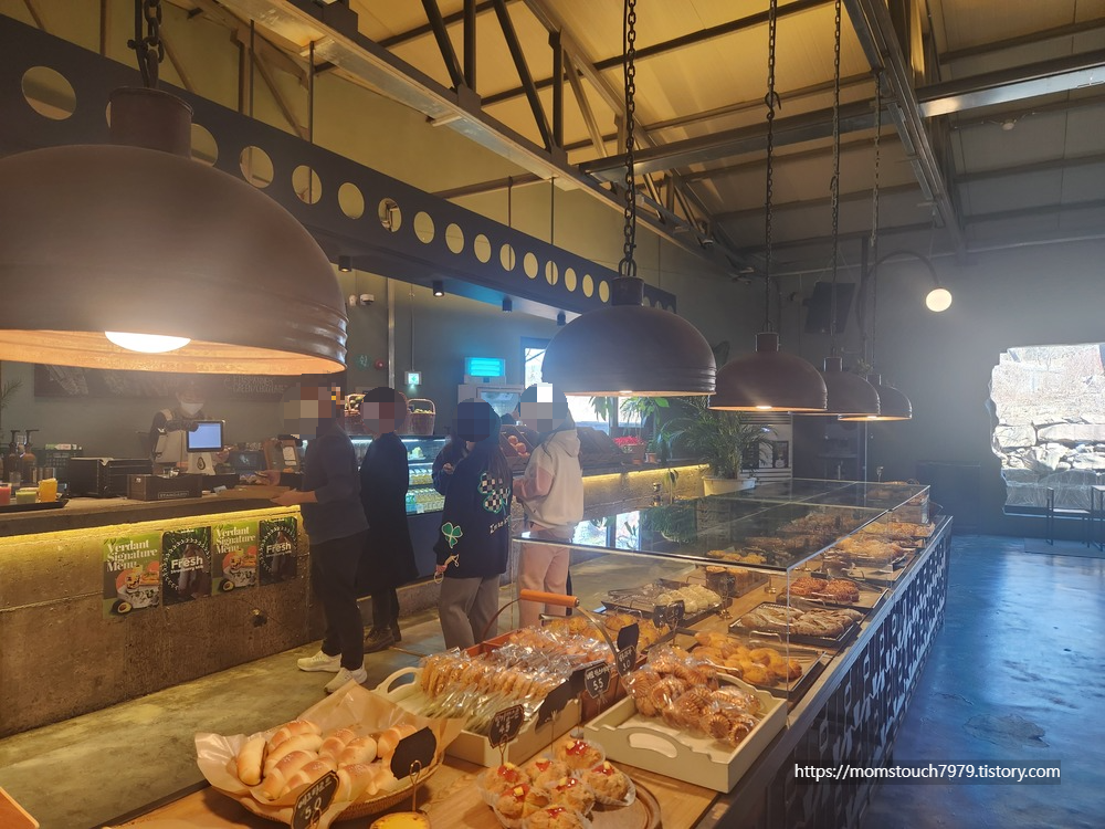 다양한 베이커리와 신선한 과일들이 있는 주문하는 공간도 넓직하게 확보해서 사람이 많아도 여유있게 느껴질 것 같았습니다. 전체적으로 카페가 층고도 높고 넓어 카페 버던트에 들어가면 시원하고 쾌적한 느낌을 지울수가 없었습니다.