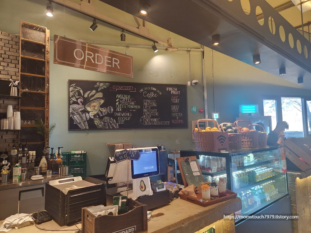 들어가는 입구부터 제가 너무 좋아하는 초록색의 뷰가 펼쳐지고 있답니다. 카페 버턴트의 경우 실내와 실외에 모두 식물을 인테리어로 하고 있습니다. 창고 같은 분위기가 신선한 과일과 나무들로 채워지니 더 편안하고 아늑한 공간이 연출되어 많은 이들에게 사랑을 받는 이유가 아닐까 하고 생각하게 되었습니다.이곳 입구에서 인증 사진 많이들 남기십니다.이웃님들도 인생샷 찰칵^^ 한 장 꼬옥 남겨 보시길 바랍니다.