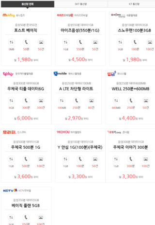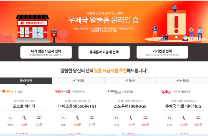 ★ 인터넷 우체국 가입, 직접 방문하여 가입 시 이용 통신망은 동일하며 SK, LG U+, KT 통신망의 요금제들이 나와 있습니다.