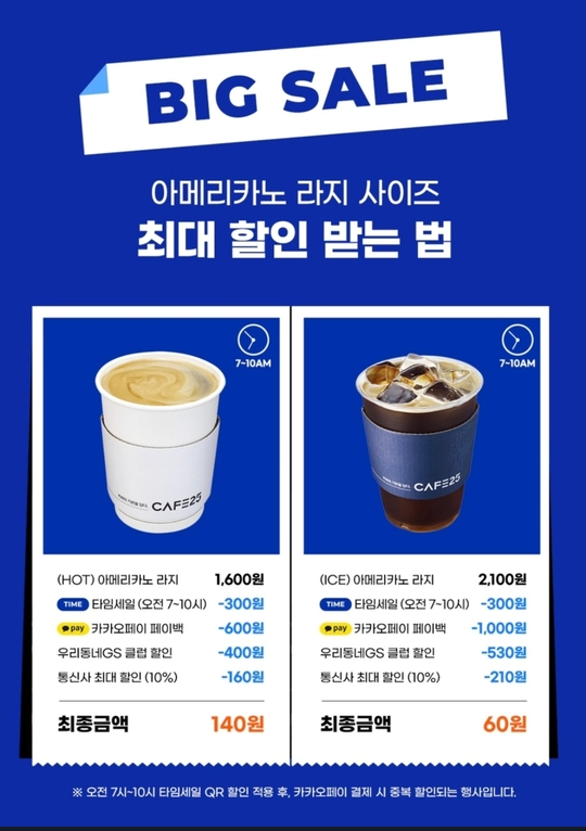 사진에서 보셨듯이 맨 위에 가격은 원래의 HOT/ICE커피 음료 가격입니다. 커피를 오전 7시 ~ 오전 10시에 마신다면 큰 컵 핫/아이스아메리카노 QR할인으로 300원 더 할인되고 있습니다. 여기에 페이백 행사까지 더해지면 아이스아메리카노 (큰 컵)는 1,000D원 할인,핫아메리카노(큰 컵)는 600원 할인을 더 할 수 있습니다.