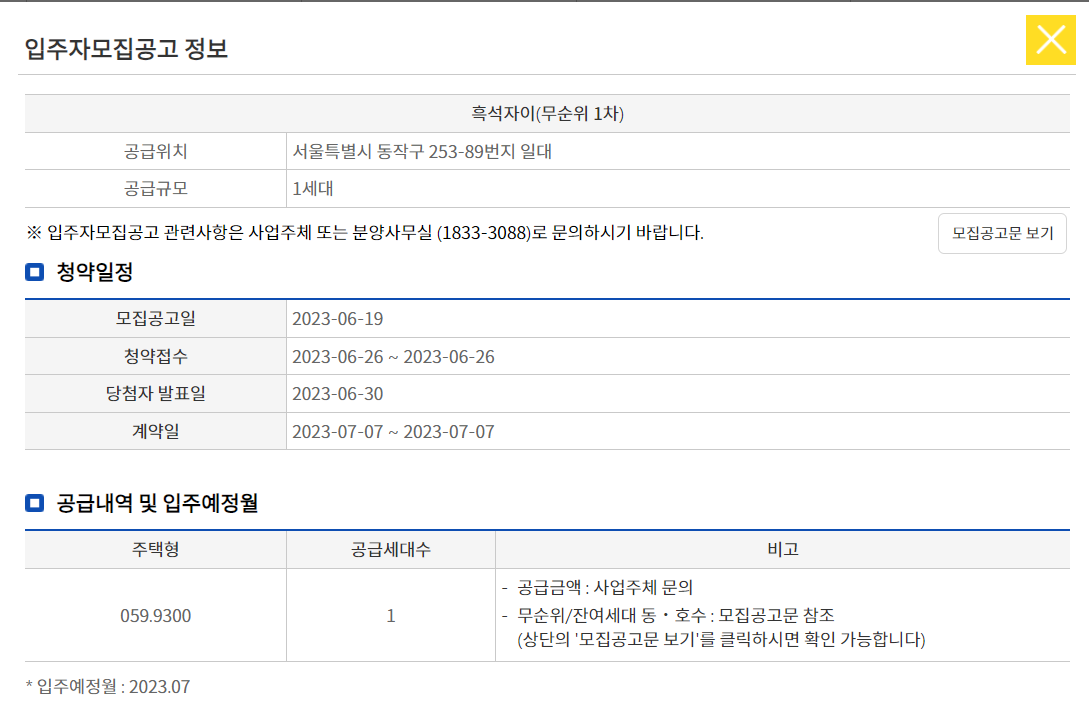 다른 하나의 계약 취소 주택은 전용면적 84㎡이며 청약 조건은 무순위 청약과는 다릅니다. 서울시에 거주하는 만 19세 이상인 무주택자만 신청이 가능합니다. 분양가는 9억6790만원입니다.흑석자이의 현재 시세를 보면 전용면적 84㎡의 경우는 매물 최저 호가가 16억원 안팎이며 5억 원 이상의 시세차익을 기대할 수 있다고 보입니다.