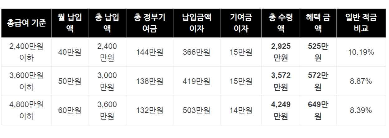 전체적으로 총소득 2,400만원2,400만 원 이하인 청년이 가장 큰 혜택을 보지만, 2,400만 원 이상 6,000만 원 이하 청년들도 이에 못지않은 혜택을 받을 수 있습니다. 다만, 소득 구간이 낮을수록 월 기여금을 최대한으로 받기 위해 납입해야 할 금액이 작아지기 때문에 적금 유지에 대한 부담감이 덜한 편입니다. 다만 7,500만 원 이하 구간은 기여금이 없기 때문에 비과세 혜택만 간신히 받아 시중은행에서 6.50% 적금에 가입한 것과 비슷한 효과일 수 있습니다. 현재 적금 금리가 꽤 올랐다고는 하지만 많은 시장의 적금 상품들이 우대금리 세부사항이 덕지덕지 붙어있어 조건을 충족시키기 어려운 만큼, 단순 적금 상품을 대체할 용도로는 썩 훌륭한 편이라고 여겨집니다. 다만, 가입 기간이 너무 길어 중도해지 시 정부지원금과 비과세 혜택을 받지 못하는 것은 주의해야 할 사항입니다. 정부기여금은 소득에 따라 70만 원을 전부 납부하지 않아도 최대로 받을 수 있기 때문에, 소득기준에 따라 최대 효과를 보는 경우는 다음과 같습니다.